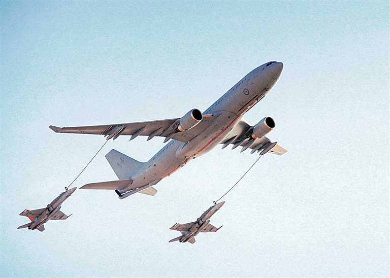 3月3日,在澳大利亚国际航空航天和国防博览会上,一架C-130运输机为两架F-18战斗机加油。 2017澳大利亚国际航空航天和国防博览会3日在墨尔本西南部的阿瓦隆机场对公众开放。 新华社发(归清摄)