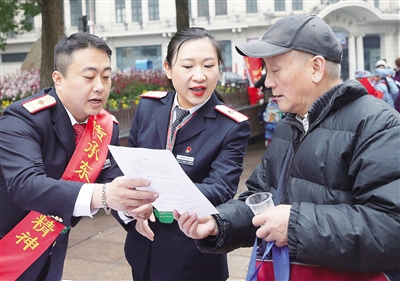3月5日,上海铁路局上海客运段志愿者在南京路为游客提供咨询服务。 新华社记者 陈飞 摄