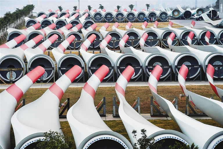 3月5日,风电叶片整齐地堆放在东方电气风电(凉山)有限公司厂区内。 从2015年开始,四川大凉山依托千万千瓦风电基地项目,积极引进风电装备制造企业及配套企业,目前已建成具有完整风电产业链的新工业园区——凉山(德昌)风电装备制造示范基地,打造风电装备制造集群,年产值达50亿元,吸纳当地剩余劳动力2000余人,同时带动当地基础设施建设和大件物流发展,在绿色发展和产业扶贫两方面收获成效。 新华社记者 江宏景 摄