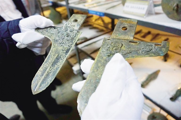 记者随后在青白江区博物馆目睹了这批青铜器的“芳容”:只见鼎、壶、敦、鍪,戈、钺、剑、矛,斤、凿、锯、削,品种多样、琳琅满目,形制优美、花纹绚丽,精致小巧、富有品味,让人领略到古蜀文明的丰富多彩,另外有少量青铜容器风格与楚文化青铜器风格接近。其中一件青铜盏,盖、身大部分饰蟠螭纹,捉手、器耳、器足采用透雕、浮雕工艺,精美异常,可见当时制造工艺的精湛;有两件青铜戈,戈身上分别绘有精致的龙纹、虎纹浮雕,活脱脱一个“虎踞龙盘”;还有一套约4厘米长、颇为精致的各式铜削刀等微小器具。