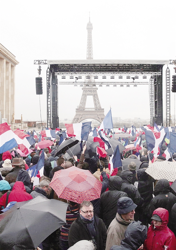 3月5日,在法国巴黎,支持者参加总统候选人弗朗索瓦·菲永的竞选集会。 法国共和党总统候选人、前总理弗朗索瓦·菲永3日因“空饷门”连受重创,其竞选经理和发言人双双辞职,而某个中间派政党也宣布不再支持他。尽管要求他退选的呼声高涨,但是菲永仍然于5日在巴黎市中心举行竞选集会。法国《鸭鸣报》曝料称,菲永的妻子佩内洛普在15年内以议员助理身份领薪至少68万欧元(约合498万元人民币),菲永的儿子和女儿也曾从议会领取薪酬,但实际上3人均为“吃空饷”。 新华社/法新