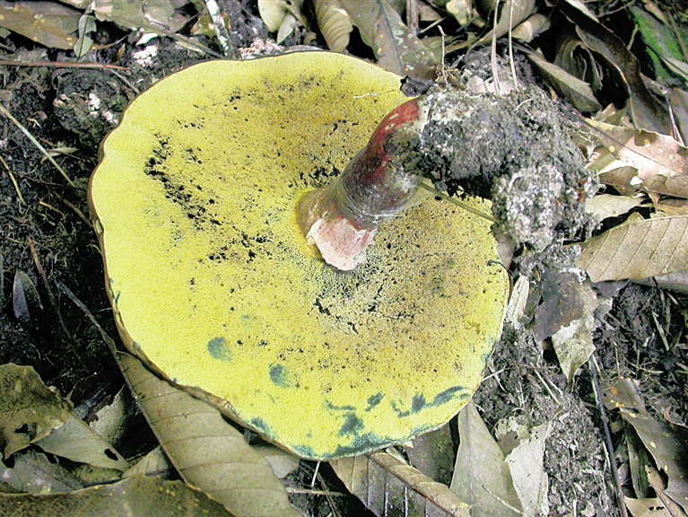 “海南黄肉牛肝菌主要特征是个体大,菌盖直径成熟时可达20公分,而其他牛肝菌,菌盖直径通常不超过10公分。”曾念开介绍说,最为有趣的,是它奇妙的变色现象,用手触摸菌盖下的菌孔以及菌肉,会迅速变蓝色,之后再变成红色,最后变为黑色。