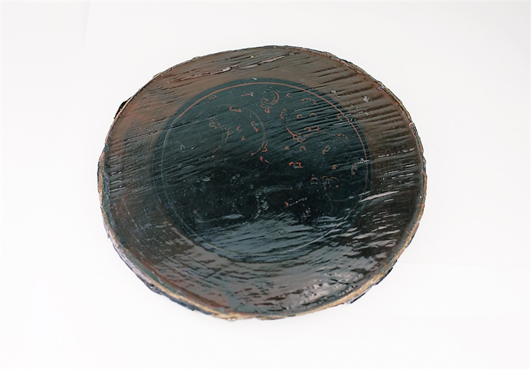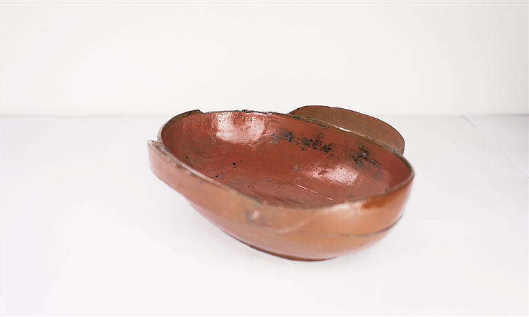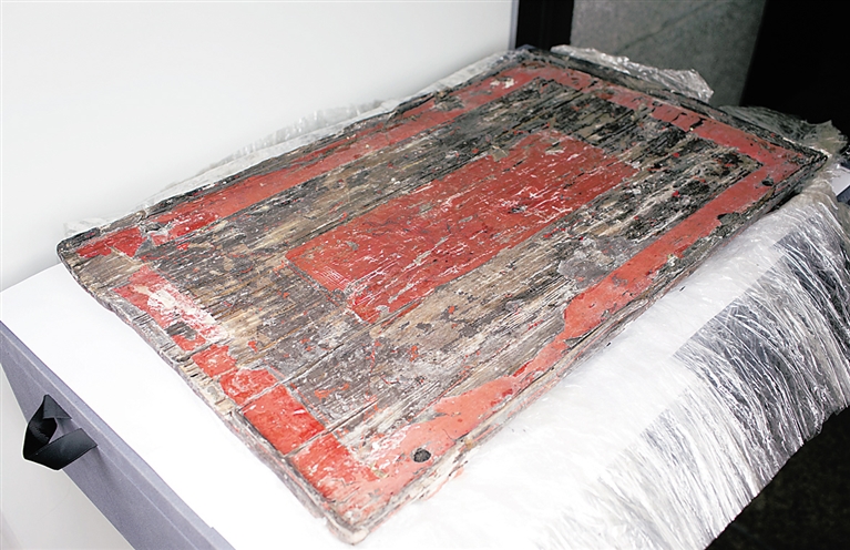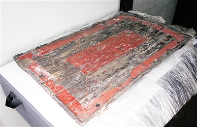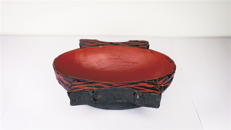 另有一件圆形的物件,外圈髹涂红丹砂漆,因时间久远,已成深棕色;中间髹涂黑色漆并绘以纹饰。“这是一个樽的底盘”王建中说,樽是一种酒器,经常与勺、杯共出,它不仅可以用来盛酒,也可以被用来盛放食物。