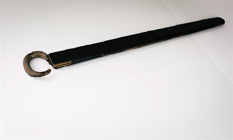 “这把削竹刀算是文房用品。”姜雷介绍,汉代的铁制文具刀用来削竹子,而这竹子就是当时的“纸张”。铁制的刀具早已生锈,紧紧地嵌在了漆器刀鞘中。