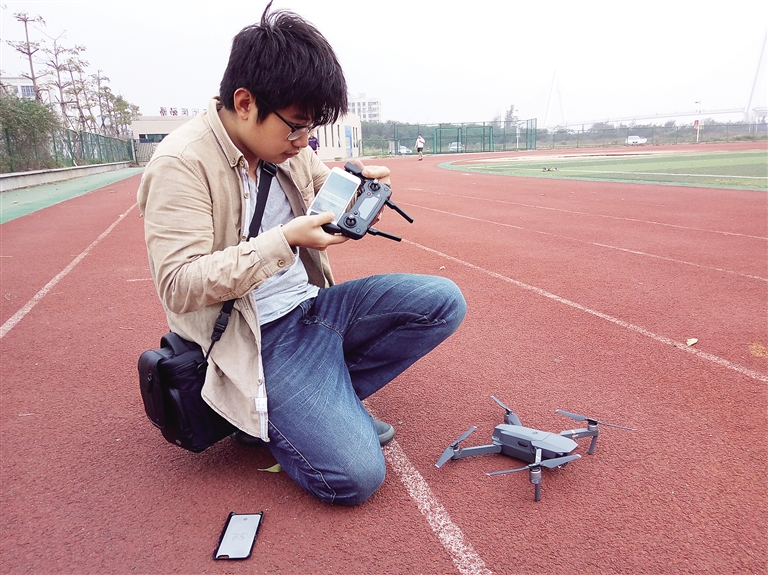 近日,在海南大学田径场,海南日报记者如约见到林子琦。他今年23岁,看起来有些腼腆,他挎着一个小包,里面装着一个袖珍的航拍机。应记者要求,他带着航拍器械来演示如何操作航拍。