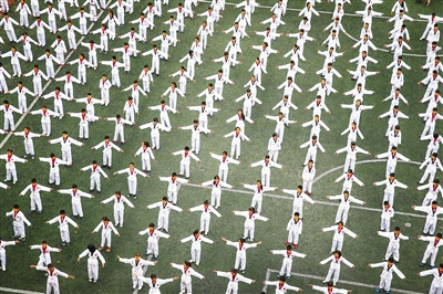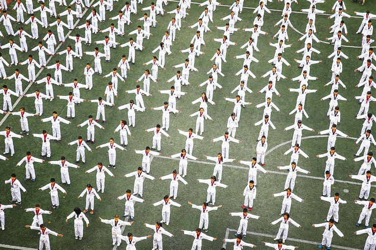 3月6日,在海口市城西中学操场,千名学生进行“跆拳礼仪广播体操+跑操”大课间体育运动。这套集热身操、礼仪操、防身操等多项内容为一体的大课间体育运动深受学生喜爱,这项运动提倡的“礼仪,廉耻,忍耐,克己,百折不屈”的精神也感染了学生们。