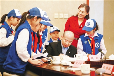 互动 3月6日,全国政协十二届五次会议分组讨论政府工作报告。当天下午,台联24组的分组讨论结束后,政协委员现场为采访的小记者们题字,勉励孩子们好好学习,将来做一个对国家对社会有用的人。 本报特派记者 张杰 摄