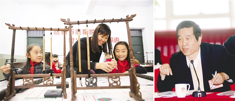 右图:2017年3月4日,全国政协委员苏士澍在全国政协十二届五次会议讨论中模仿某些不规范的执笔动作。苏士澍指出,中小学书法教育依然存在教育资源分布不均衡、书法教师短缺、开课率不足等教学瓶颈和困难。他建议设立“汉字书写日”,加强书法教师培养,大力推进“书法进课堂”的汉字书写教育。左图:2016年10月25日,在河南省焦作市武陟县三阳乡三阳小学,学生们在老师的指导下练习书法。 新华社发