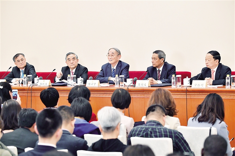3月6日,全国政协十二届五次会议在北京人民大会堂新闻发布厅召开记者会,邀请全国政协委员厉以宁、陈锡文、杨凯生、常振明、钱颖一就深入推进“三去一降一补”、深入推进农业供给侧结构性改革、着力振兴实体经济、防范金融风险、推进“一带一路”建设等回答记者提问。 新华社记者 李鑫 摄