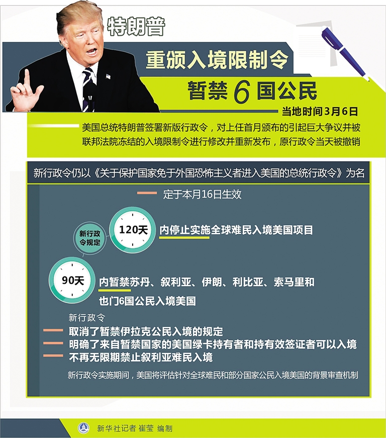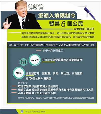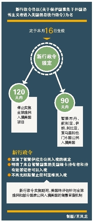 新行政令保留了原行政令的名称,定于3月16日生效。新行政令规定在120天内停止实施全球难民入境美国项目,90天内暂禁来自苏丹、叙利亚、也门、伊朗、索马里和利比亚6国公民入境美国。