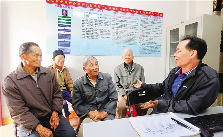 3月8日,东方市四更镇长山村4位80岁以上农民在村级便民代办点办理高龄补贴。