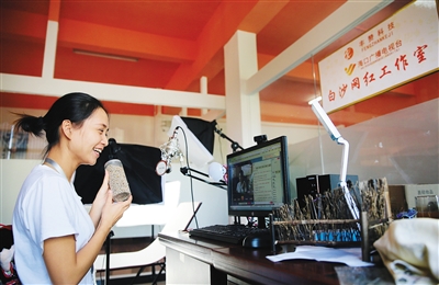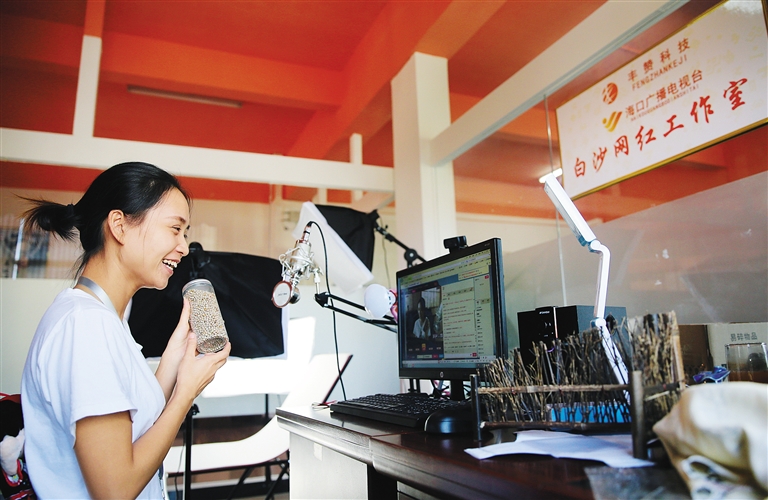 位于白沙电子商务产业园里的白沙网红工作室,一位“网红”正在通过网络推销当地贫困户种植的胡椒产品。