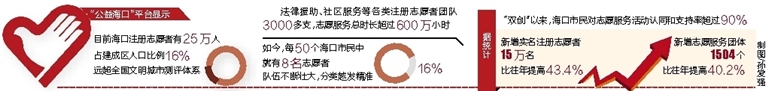 韩美介绍,海口今年把志愿服务事业列入为民办实事事项,是借鉴上海市的经验。具体内容包括:运营维护“七有”标准社区志愿服务站20个,实施“社会关爱”系列志愿服务项目,打造民间应急救援、关爱心理辅导等专业化志愿服务队伍,发展壮大府城志愿者联盟、海口市青年志愿者协会等志愿服务团队。