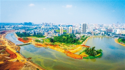 3月3日,高空鸟瞰海口市正在如火如荼进行改造的凤翔公园。据了解,凤翔公园美舍河生态修复示范段建设加快推进,截至3月1日,生态修复已完成清表4.75万平方米,土方填筑6.1万立方米,开挖土方4.58万立方米,完成进度30%,近期将完成凤翔公园美舍河示范段的建设,还海口市民绿树绕岸、碧水潺潺之美景。本报记者 张茂 摄