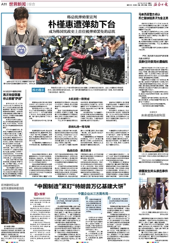 韩国宪法法院10日上午宣布赞成弹劾总统朴槿惠,立即解除其总统职务。由此,朴槿惠成为韩国宪政史上首位被弹劾罢免的总统。这一宣判意味着韩国长达92天的领导层危机告一段落,同时也意味着下届总统选战一触即发。