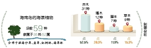 “我们是国内第一个系统研究海漂植物并发表中文研究论文的团队。”海南大学园林园艺学院院长宋希强告诉记者,他们经过对海南岛历时1年的调查,系统整理了海南岛上的海漂植物,发现海南岛滨海地区海漂植物共有35科52属59种,分别生长在滨海沙岸、岩岸、浅海中,有乔木、灌木、藤本和草本。虽然生长环境各不相同、植物类别各异,但它们都拥有一些共同的特点,即种子或植株能够通过海水传播到其他地方继续繁衍,而且都耐盐、耐旱,其中很多是优良的园林树种、沿海防护林树种和海岸生态恢复树种。其中,最为著名的海漂植物包括椰树、红树林、榄仁、木麻黄等植物。