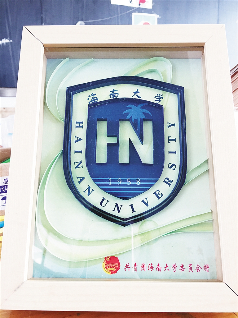 以“海大小笨笨”创作《海南大学校徽》为例,校徽是具体存在的形象,但如何用线条优雅地摆在底板上,将衍纸作品做得惟妙惟肖,可让设计者废了不少心思。“那些看似难做的立体花朵、枝叶反而是最容易把握的。反倒是作品中如果需要用纸条摆造型,才是最难掌控的。”崔阳说,这幅作品是“海大小笨笨”前任会长李凯设计,构思好了比例,将图案手绘在底板上,一遍遍尝试保持纸条的流线型,再将纸条粘牢,“受纸条属性的影响,要让纸条自然游走,就要付诸足够的耐心,并有毅力不断尝试。”