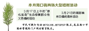 本报海口3月12日讯 (记者计思佳)最是一年春光好,植树添绿正当时。今天是植树节,海口市开展义务植树活动,共有3000多人参加。记者了解到,海口将今年3月定为“义务植树活动月”,接下来还有一系列植树补绿活动。海口市园林局绿委办相关负责人表示,海口企业、市民全年都可报名参加义务植树,园林局可提供“私人订制”服务。