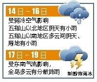 本报海口3月13日讯 (记者叶媛媛 通讯员许嘉 李凡)海南省气象台预计,14日~19日,受弱冷空气影响,我省五指山以北地区多阴雨天气,气温下降,全省最低气温18℃。