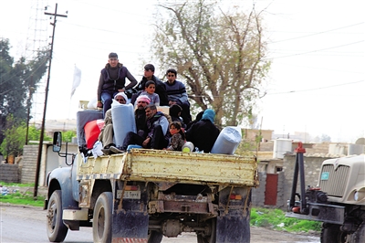 3月14日,伊拉克摩苏尔平民乘卡车撤离交战区。 伊拉克政府军14日继续在摩苏尔西部城区推进,大批平民被迫从交战区撤离。伊拉克难民和移民部长贾西姆·穆罕默德表示,自摩苏尔西城收复战开始,该部工作组已经接收将近10万名平民。 新华社发