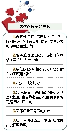 但是,热敷不是万能的,部分疾病不能使用这种方法。此外,热敷过程中还要注意观察局部皮肤颜色的变化,避免长时间在一个部位热敷,以免烫伤。尤其是皮肤感觉不太敏感的老人、小孩、糖尿病伴有神经病变及中风患者,更要注意控制温度。热敷后要做好保暖,不要立即外出,以免着凉。(生时)