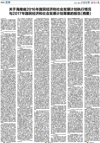 关于海南省2016年国民经济和社会发展计划执行情况与2017年国民经济和社会发展计划草案的报告(摘要)