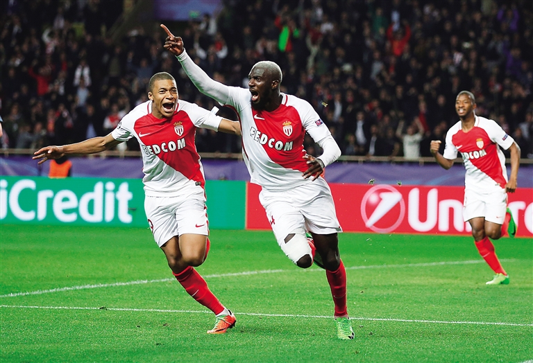 摩纳哥队球员巴卡约科(左二)打入致胜进球后与队友庆祝。 新华社发