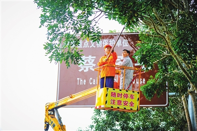 日前,琼海市路灯管理处工作人员在博鳌镇修剪树枝,装新扮靓城镇面貌,以新风貌、新气象迎接博鳌亚洲论坛年会。本报记者 袁琛 摄