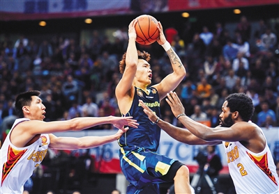广东队球员赵睿(中)在比赛中上篮。新华社发