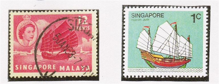 1955年9月4日和1980年4月26日,马来联邦和新加坡先后发行一套《帆船》普通邮票,其中1955年那套12C一枚和1980年那套1C一枚均为“海南船”,这是迄今为止发现的最早出现在外国邮票上的海南题材。