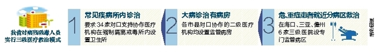 据了解,目前已完善了医疗保障机制的建立和落实,实行对病残吸毒人员三级医疗救治模式。一、常见疾病所内诊治。去年11月以来,省卫计委全面承担起公安监管场所医疗卫生和司法行政强制隔离戒毒场所传染性疾病的预防控制,规范诊疗行为,要求34家对口支持协作医疗机构在强制隔离戒毒所内设置卫生所,申请办理医疗机构执业许可证,明确法人代表为对口支持医疗机构负责人,并落实相关责任,同时协作医院派驻有资质的医护人员24小时在卫生所值守,确保被强制隔离戒毒人员小病诊治不出所;二、大病诊治有病房。各市县对口协作的二级医疗机构均设置监管病房,被强制隔离戒毒人员患大病在医疗卫生所有限条件下无法治疗者可进入当地对口协作的二级医院监管病房住院治疗;三、危、重症患者就近分病区救治。按照辖区分布,分别在海口、三亚、儋州市6家三级医院设立专门的监管病区,保证被强制隔离戒毒病残人员患危、重疾病得到救治。