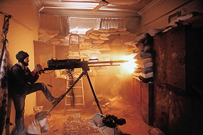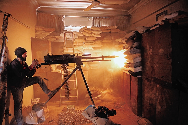 3月19日,在叙利亚大马士革东郊的朱巴尔区,一名反政府武装人员在用机枪射击。 叙利亚政府军19日在首都大马士革东郊与试图向市区渗透的反政府武装发生激战,反政府武装被击退。 新华社/法新