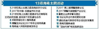 一是继续将服务国家总体外交和海南参与“一带一路”建设紧密结合,促进地方经济社会发展。组织策划“21世纪海上丝绸之路岛屿经济”“2017年中国-东盟省市长对话”等精品政治外交分论坛,为密切我国地方省市与东盟国家地方政府和民间的务实合作关系提供海南方案,为丝路岛屿经济体的可持续健康发展贡献海南智慧。部分参会外国政要也将出席海南主题活动。