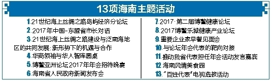 三是抓住一切机会、平台展示海南作为论坛东道地的独特魅力。我省将继续与论坛秘书处联合举办“博鳌亚洲论坛2017年年会招待晚宴”,通过省主要领导致欢迎辞,并在宴会期间视情安排海南特色文艺演出、海南特色美食、播放海南宣传片等方式宣传、展示海南;推动我省代表担任“金融业的绿色革命”“澜湄六国佛教领袖对话”等分论坛的讨论嘉宾,讲好海南故事;举办“海南省人民政府新闻发布会”,发出海南声音;开展“论坛‘百姓代表’电视选拔活动”,加强海南百姓对论坛的参与和互动;策划举办《一代宗师 十世班禅》巨幅唐卡艺术精品展,丰富论坛会外的中国文化元素;继续举办“海南风情美食园”活动,并对活动内容和场地进一步扩展和丰富,一方面使代表有机会体验海南美食文化,另一方面利用活动平台对我省相关产业进行宣介,今年的宣介主题为现代农业。
