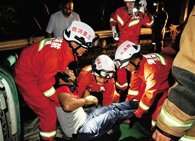 当天凌晨2时许,三亚市绕城高速火车站互通出口处,一辆在工地刚收工的拖拉机发生侧翻,路边坐着多名受伤人员,其中驾驶员腿部受伤,行动不便停留在驾驶室内。接警后,三亚消防特勤中队官兵火速到达现场,立即把受伤人员从驾驶室中抬出并交给现场120医务人员,然后用水枪对车辆漏油进行稀释,并协助现场医务人员把其余受伤人员抬上救护车。