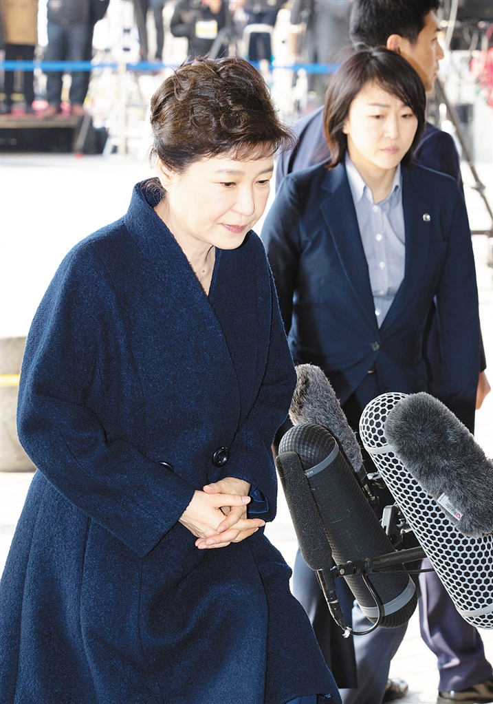3月21日,在韩国首尔,朴槿惠抵达检察厅。 当日,在韩国首尔,韩国前总统朴槿惠就亲信干政事件接受检方传唤。 新华社发