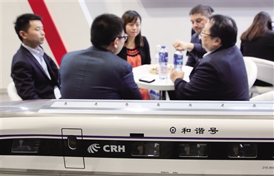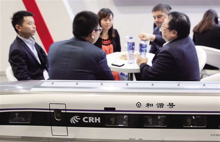 3月21日,来自中国中车股份有限公司的代表在与客户洽谈业务。 当日,为期两天的2017亚太铁路大会在香港会议展览中心开幕,来自多个国家和地区的企业参展。 新华社发(王玺 摄)