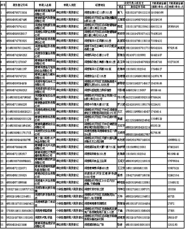 根据《中华人民共和国税收征收管理法》第四十五条、《中华人民共和国税收征收管理法实施细则》第七十六条等有关规定,现将以下纳税人予以公告(国税欠税金额截至2017年3月20日,地税欠税金额截至2017年3月17日),公告所涉及的纳税人,必须及时与主管税务机关联系,按照规定办理解缴所欠税款事宜,否则,税务机关将按照规定采取执法措施。 洋浦经济开发区国家税务局 洋浦经济开发区地方税务局 2017年3月21日