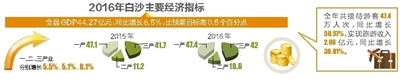 通过产业结构的优化调整和重点产业的培育,白沙取得喜人的成绩。2016年白沙全县实现地区生产总值44.27亿元,同比增长6.5%,比预期目标高0.5个百分点。一、二、三产业分别增长5.5%、5.1%、8.1%,三次产业结构从2015年47.1:11.2:41.7调整为47.4:10.6:42。