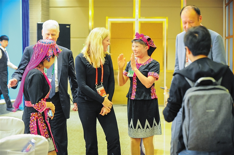 嘉宾和身着少数民族服装的工作人员交流。 本报记者 袁琛 摄