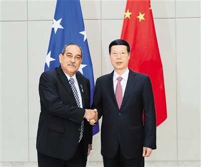 3月24日,中共中央政治局常委、国务院副总理张高丽在海南博鳌会见密克罗尼西亚联邦总统克里斯琴。 新华社记者 王晔 摄