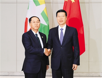 3月24日,中共中央政治局常委、国务院副总理张高丽在海南博鳌会见缅甸副总统吴敏瑞。 新华社记者 谢环驰 摄