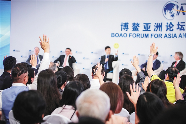 3月25日,博鳌亚洲论坛2017年年会“未来的商业”分论坛上,与会者举手提问。 本报记者 袁琛 摄