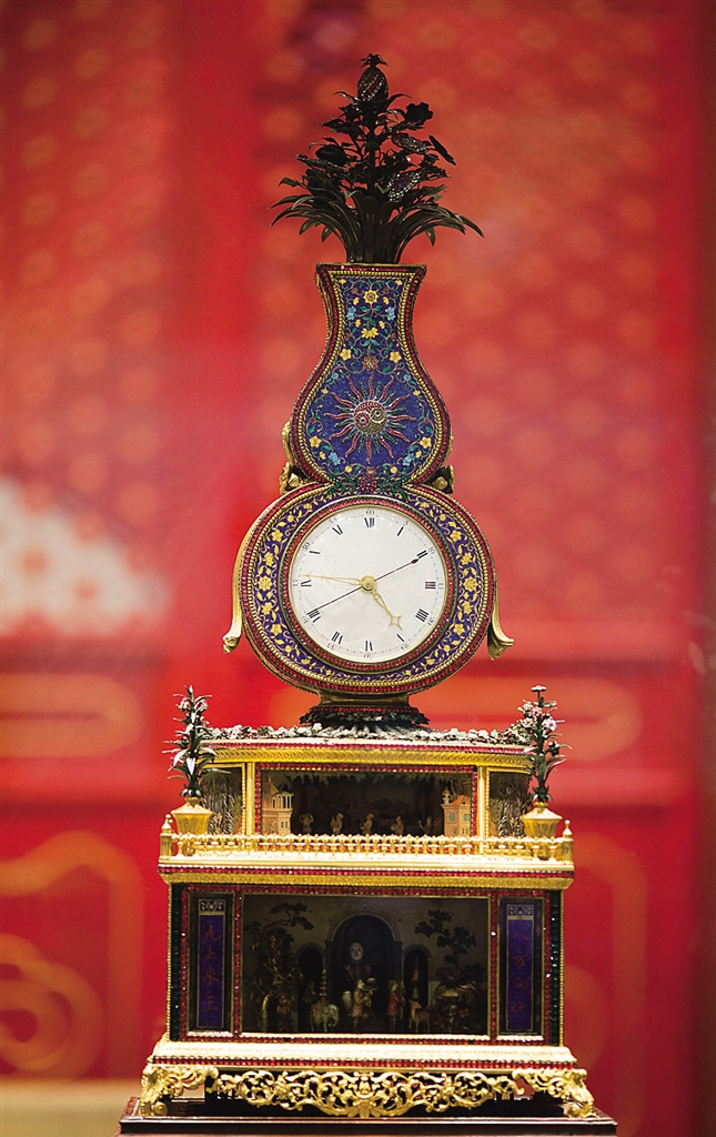 此次《对话:紫禁城与海上丝绸之路》展览中共带来了三件大型座钟,一件是18世纪时英国制造的铜镀金嵌料石转人升降塔钟,一件是清代乾隆年间广州制造的铜镀金珐琅转花葫芦式钟,还有一件是尺寸较大的英国制造的铜镀金转人转花容镜站马钟。