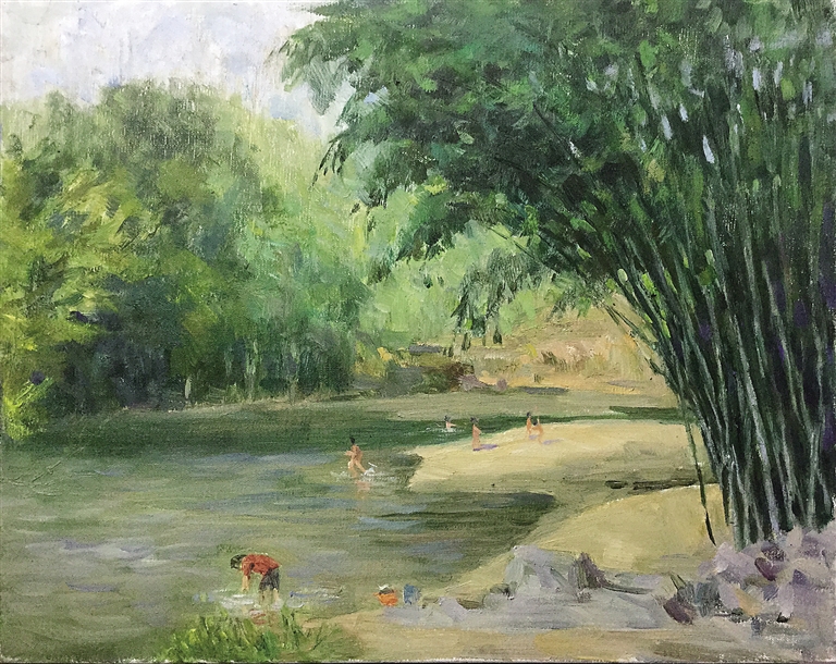 白沙罗帅村坐落在鹦哥岭山脚下,是典型的热带雨林环境。久闻其名,今日一见,果然不同凡响。屋前屋后皆为小景,处处都可入画。有一条小河绕村流过,清澈的山泉和潺潺的水声,给这美丽的村庄添色不少。徜徉在村道上,恍如进入了传说中的桃花源。我沿河觅景写生,也想让自己整个身心能融入此山彼水中。由于山里气候不稳定,时晴时阴且变幻莫测,影响到写生的情绪,可我还是努力尝试去完成了四幅小画。