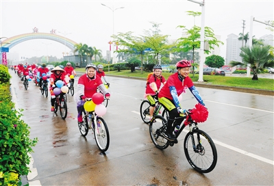 3月26日上午,澄迈县金江镇迎来一场特殊的婚礼。在澄迈自行车协会的协助下,52位自行车骑行爱好者组成车队绕行县城,为新郎戴文昊迎新“护驾”。据悉,戴文昊是澄迈特殊教育学校的一名教师,与新娘在自行车骑行活动中相识相恋。当天参加迎新的车友纷纷表示,自行车绿色骑行迎亲,既绿色、低碳、环保,又节俭、时尚而富有个性,值得社会倡导。 通讯员 王家专 摄