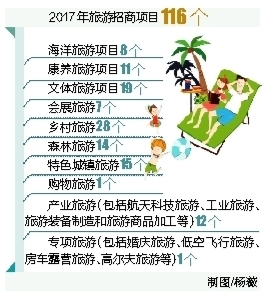据介绍,116个招商项目包括海口市公共码头及海上旅游项目、木兰湾滨海新城区项目、万宁新潭湾国家海洋公园和湿地公园项目、马龙温泉休闲度假区项目、南牛岭瀑布休闲养生旅游项目、金波康体养生休闲度假区项目、海口骑楼建筑历史文化街区保护与综合整治项目、阳江镇红色文化旅游提升项目、中国保亭甘工鸟文化旅游度假区、晶水湾大酒店、会山镇加脑苗族风情村旅游项目、龙江镇美丽乡村旅游项目、三才园村乡村休闲旅游项目、木棉谷民俗度假村项目、海南热带植物园扩建项目、后水湾海上国家森林公园项目、八门湾红树林湿地公园项目、水南历史文化旅游小镇项目、文昌华侨文化风情小镇项目、和乐龙舟渔家小镇项目、文昌市火车站站前商业广场项目等。