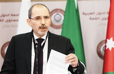 3月27日,在约旦死海之滨索瓦马,约旦外交大臣艾曼·萨法迪在记者会上发言。 第28届阿拉伯国家联盟(阿盟)首脑会议预备会议之一、阿盟外长会议3月27日在约旦死海之滨索瓦马举行。与会的各国外长一致强调,巴勒斯坦问题是整个阿拉伯世界的核心问题,实现巴以和平必须坚持“两国方案”。 新华社/法新