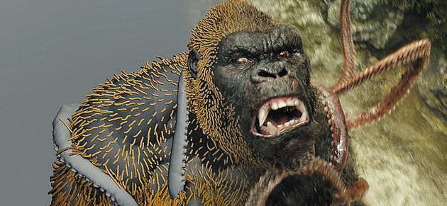 而这版金刚巨大的身形,又为这项工作带来了很大挑战。身形越巨大,需要的毛发就越多,这样才能覆盖身体。剧组预估金刚的整个身体上要覆盖1900万根毛发。剧组不能仅仅弄出又长又简单的毛发就完事了,还有两位人员专门负责金刚的毛发部分,他们花费了大约一年时间,只为让金刚卷卷的毛发能够变化方向,让一切看起来都那么天然有机有趣。从最终的成片来看,该片特效组在毛发渲染方面已经有了长足的进步。