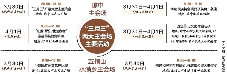 今年的海南“三月三”节庆活动设琼中、五指山市水满乡两个主会场,活动时间从3月29日(农历三月初二)至4月1日(农历三月初五),历时4天。